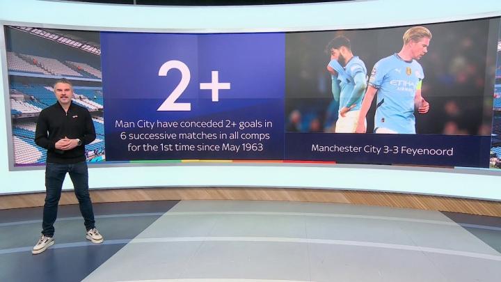 各项赛事最近6场比赛,曼城战绩为1平5负,且每场比赛都丢了至少2球,这是曼城自1963年5月以来首次连续6场比赛丢球2+。