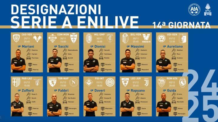 意大利的裁判协会公布了意甲第14轮各场比赛的裁判员名单,国际米兰客场与佛罗伦萨的比赛将由多维里吹罚,圭达则会执法罗马主场与亚特兰大的较量。