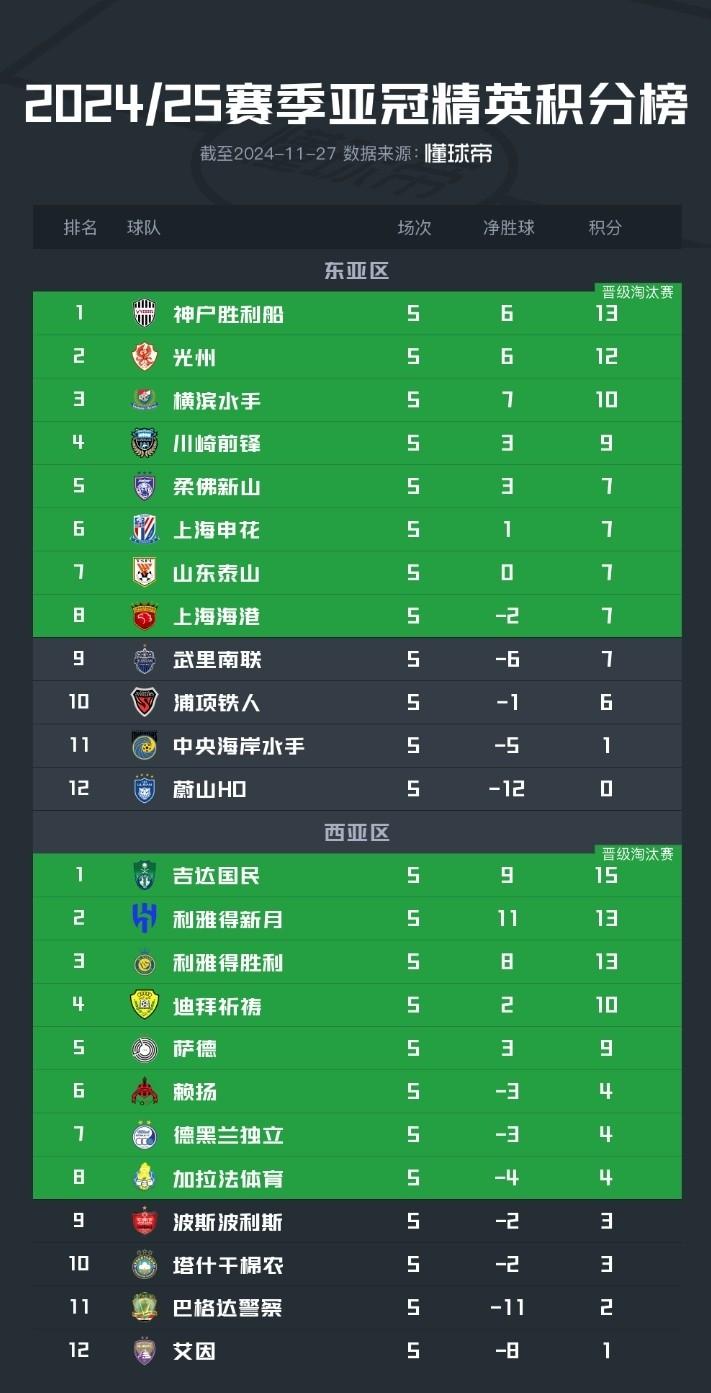 在五轮比赛之后,上海申花2胜1平2负,积7分,暂列亚冠联赛东亚区积分榜第六。