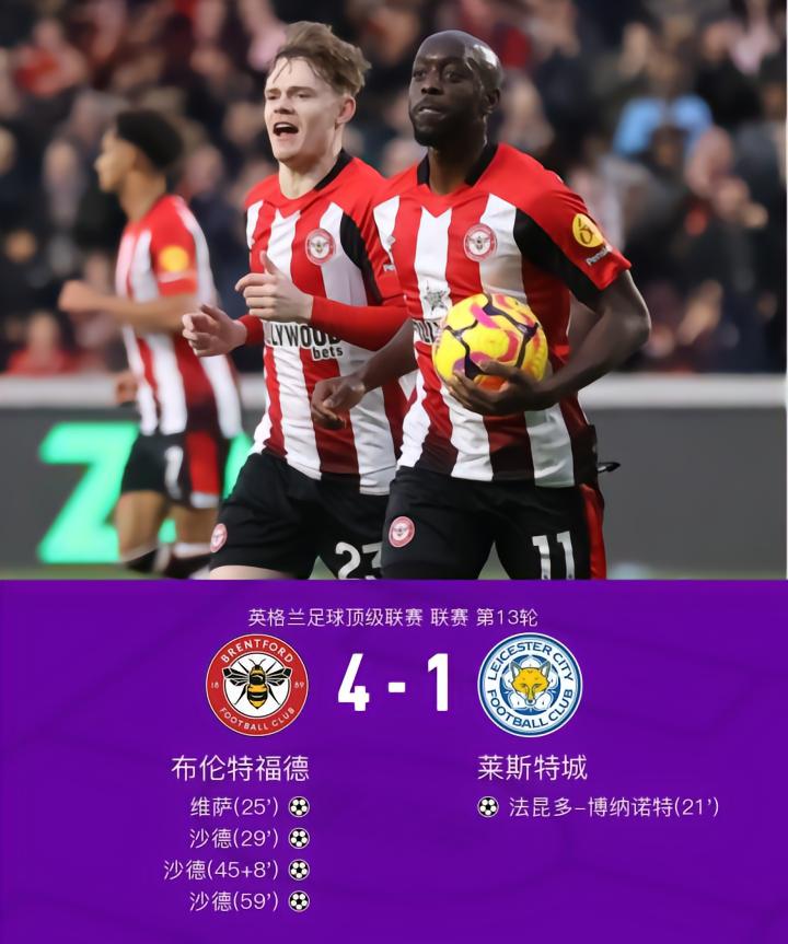 布伦特福德4-1逆转莱斯特城,沙德帽子戏法+助攻,维萨破门