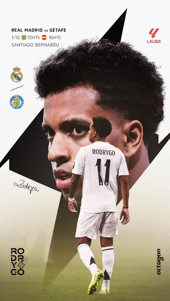 北京时间12月1日晚上23点15分,西甲第15轮比赛,皇马将在主场对阵赫塔费。今天,皇马前锋罗德里戈更新个人社媒动态,晒出个人赛前海报。