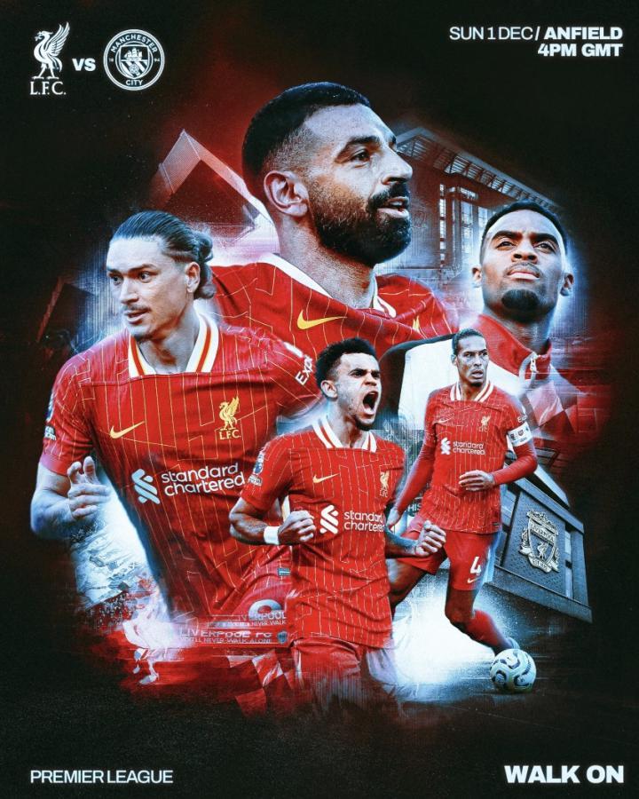 北京时间12月2日凌晨0点,英超第13轮,利物浦将在主场迎战曼城。赛前,利物浦官方发布了预热海报。