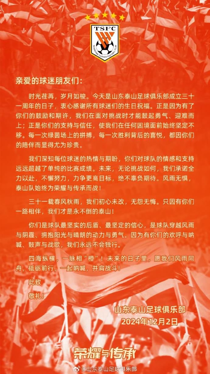 12月2日,山东泰山足球俱乐部迎来成立31周年的纪念日,俱乐部官方发布了感谢信,衷心感谢所有球迷朋友们送上的生日祝福。