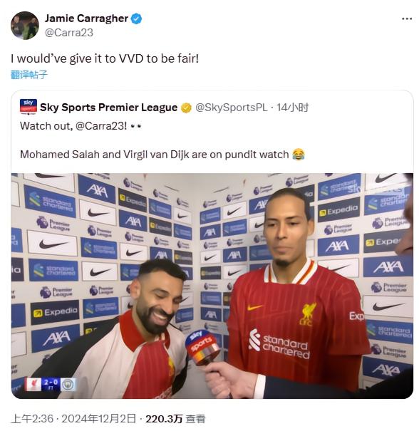 之后,在这段采访播出之后,卡拉格继续在社交媒体上表示,他会把这场比赛的全场最佳投给范戴克。