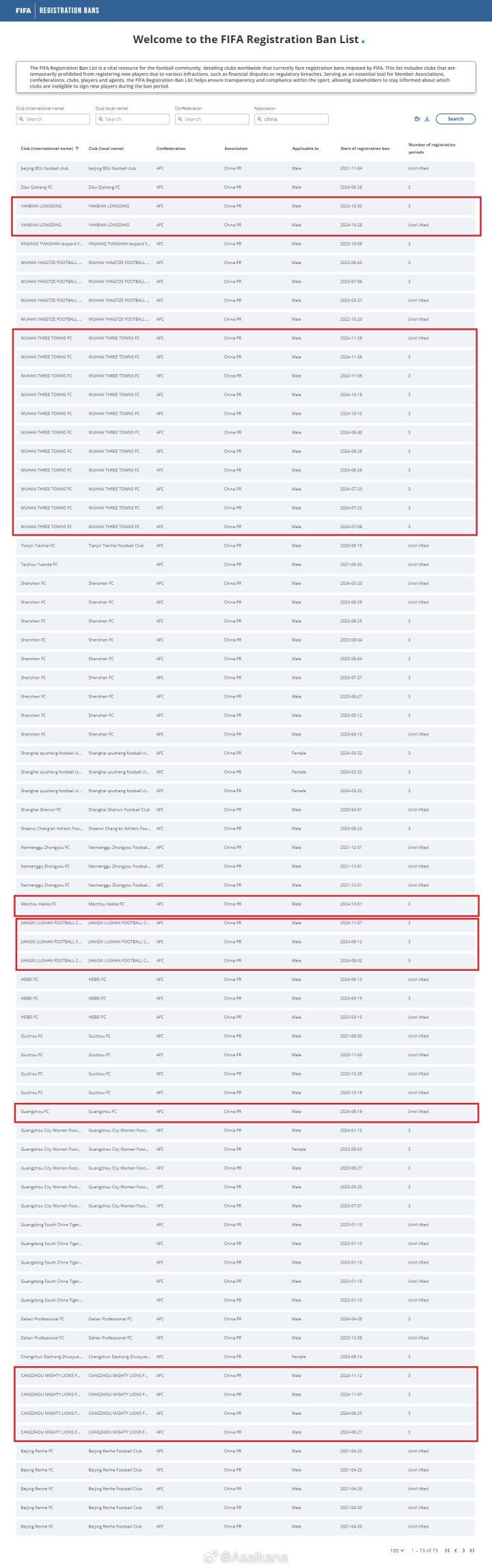 德国转会市场网站中国区管理员朱艺@Asaikana 晒出截图,在12月2日例行更新的国际足联注册禁令披露系统中,目前还存在转会注册禁令的俱乐部包括沧州雄狮(4条)、广州(1条)、江西庐山(3条)、梅州客家(1条)、武汉三镇(11条)、延边龙鼎(2条)。