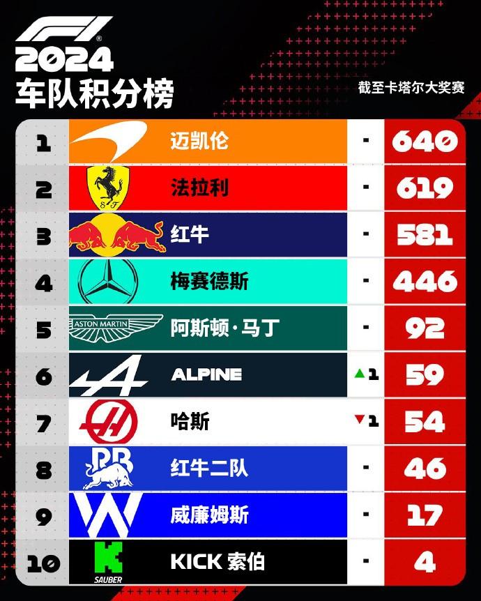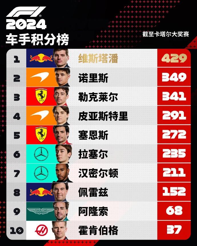 而车手积分方面,年度亚军的争夺愈发激烈,维斯塔潘429分,诺里斯349分,勒克莱尔341分,周冠宇斩获4分。