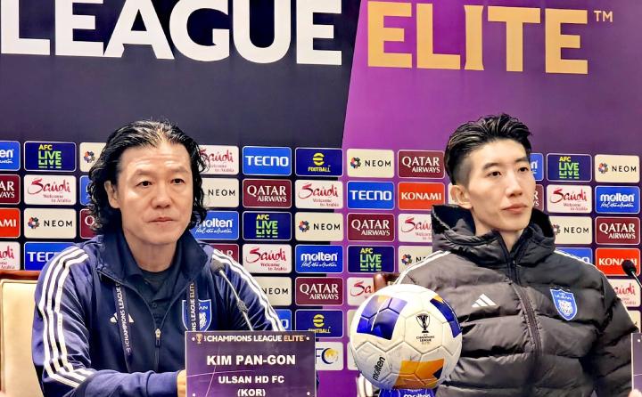 北京时间12月4日,亚冠精英赛,上海申花1-2被蔚山HD逆转。赛后,蔚山HD主教练金判坤携比赛最佳球员赵贤祐出席新闻发布会。