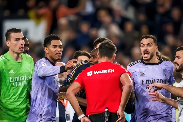 上赛季西甲第27轮,皇马客场2-2战平瓦伦西亚,主裁判希尔-曼萨诺最后时刻的判罚引发巨大争议,他在卜拉欣-迪亚斯传中时吹响了终场哨,导致贝林厄姆的绝杀进球无效,并将抗议判罚的贝林厄姆红牌罚下。