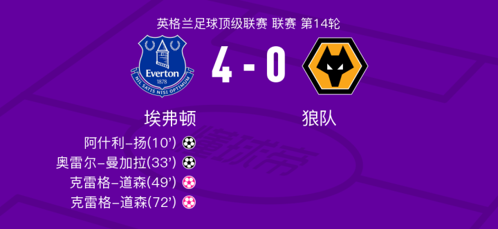 北京时间12月5日埃弗顿vs狼队,阿什利-扬得到全场最高的8.5分,若泽-萨得到全场最低的5.4分