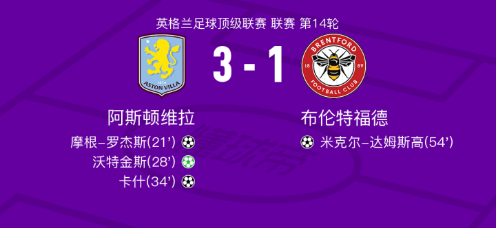 北京时间12月5日阿斯顿维拉vs布伦特福德,沃特金斯得到全场最高的8.7分,雅内尔特得到全场最低的6.2分
