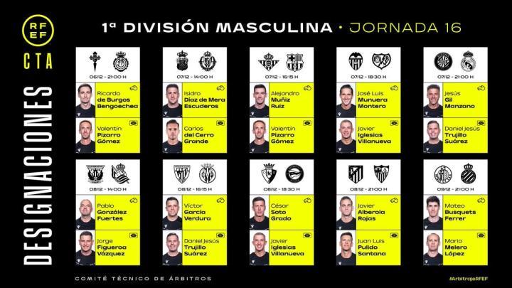 西班牙足协官方公布了西甲第16轮比赛裁判安排,希尔-曼萨诺将执法赫罗纳vs皇家马德里,亚历杭德罗-穆尼斯执法皇家贝蒂斯vs巴塞罗那。