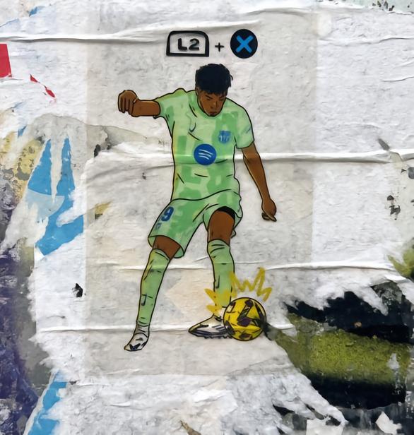 对此,插画师米基-诺埃尔创作了一幅漫画,在画中,拉明身穿客场绿色球衣,用外脚背击球,并在旁边加上了“L2+X”的游戏手柄提示符,巧妙呼应了拉明的言论。