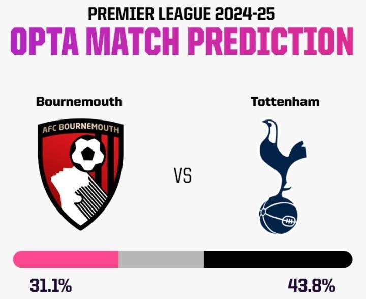 数据机构Opta在赛前进行10000次模拟,预测热刺赢下本场比赛的概率为43.8%,而伯恩茅斯取胜的机会则为31.1%,双方战平的可能性为25.1%。