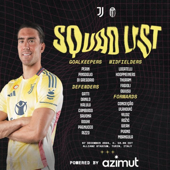 尤文图斯官方公布了意甲第15轮主场对阵博洛尼亚的比赛大名单,弗拉霍维奇、萨沃纳回归,比赛将于北京时间12月8日凌晨1点进行。