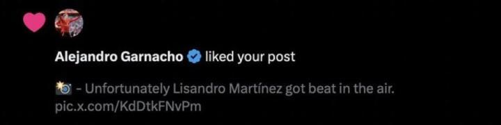 赛后,有自媒体账号TheEuropeanLad发布了曼联丢球的图片,表示:“很不幸,利桑德罗-马丁内斯在空中被击败。”加纳乔给这篇动态点了赞,该博主随后转发并配了一个问号。不过目前,加纳乔已经取消了对该帖的点赞。