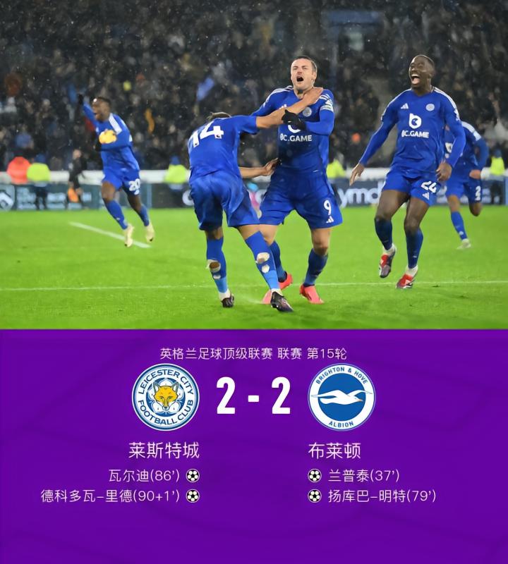 莱斯特城2-2布莱顿,瓦尔迪、里德相互传射,兰普泰世界波