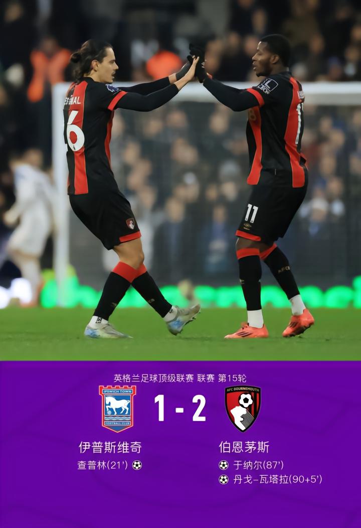 伊普斯维奇1-2伯恩茅斯,于纳尔扳平,瓦塔拉替补献绝杀