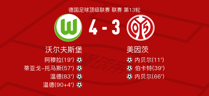 北京时间12月8日沃尔夫斯堡vs美因茨,内贝尔得到全场最高的8.7分,曾特纳得到全场最低的5.6分
