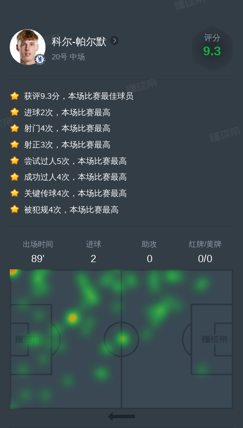 北京时间12月9日托特纳姆热刺vs切尔西,科尔-帕尔默贡献2球,4次关键传球,4次射门,4次成功过人。
