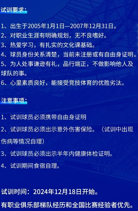 有职业俱乐部梯队经历和全国比赛经验者优先。