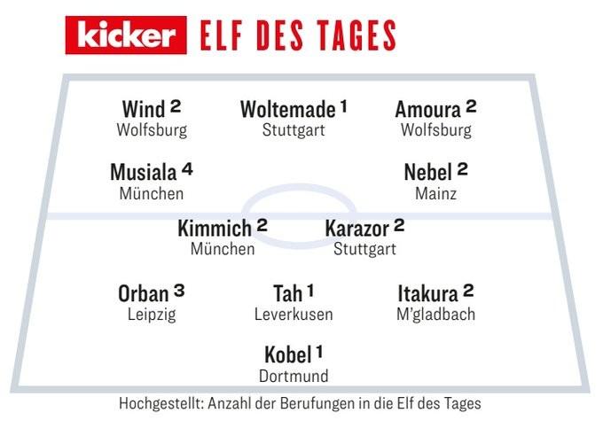 德甲第13轮比赛已经全部结束,《踢球者》杂志评出了本轮比赛的最佳阵容,其中,穆西亚拉、基米希、约纳坦-塔、科贝尔在列。