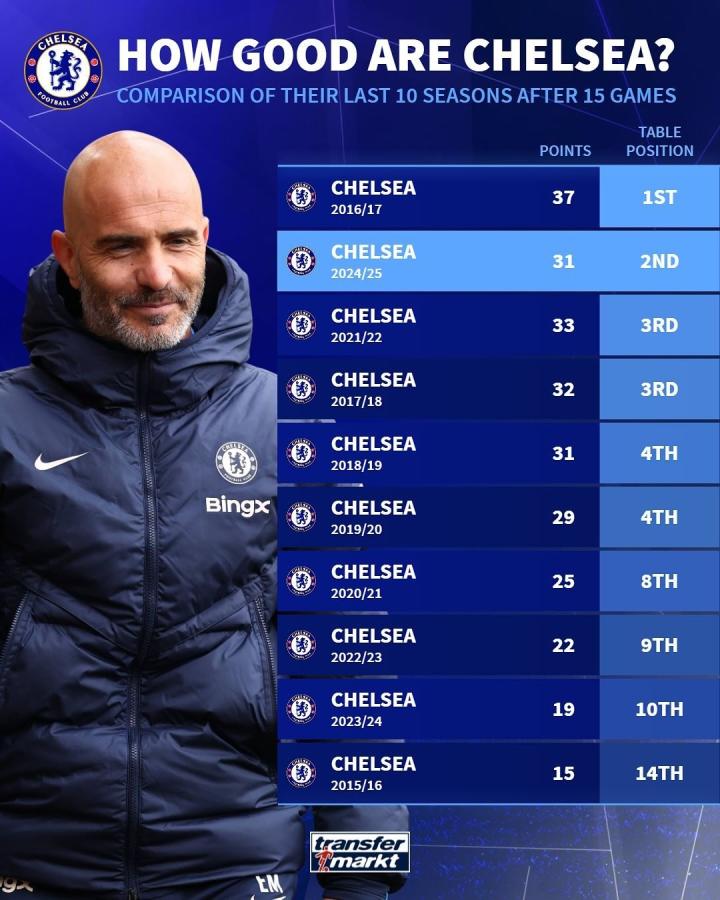 本赛季英超第15轮过后,切尔西以31分排名联赛第二,据统计,这是切尔西近10个赛季同期第二高的排名。
