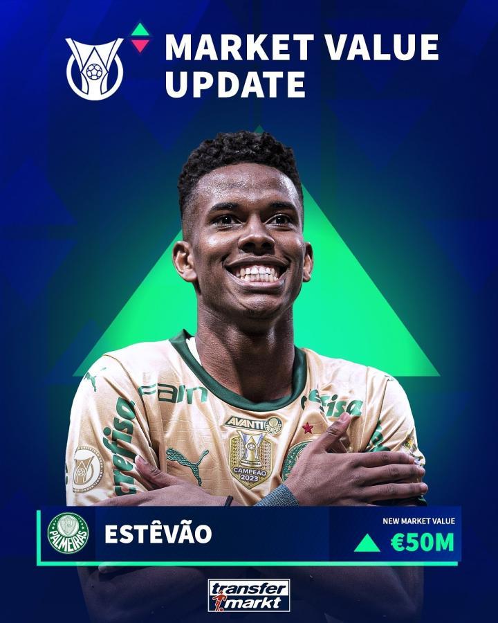 12月9日,德国转会市场网站更新了巴甲联赛球员的身价,17岁的帕尔梅拉斯前锋埃斯特旺身价上涨至5000万欧。