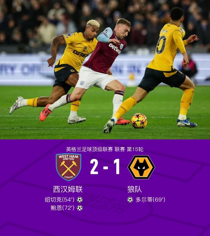 西汉姆联2-1狼队,绍切克打破僵局,鲍恩制胜进球