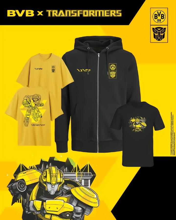 本次多特蒙德足球俱乐部与变形金刚联名的周边产品包括服饰、马克杯、背包等日常用品,专为广大球迷及变形金刚爱好者打造。产品设计融入普鲁士多特蒙德标志性的黄黑色调,并结合变形金刚经典角色“大黄蜂”的形象,将两大品牌的视觉元素完美融合呈现,为粉丝们带来全新的收藏与实用体验。