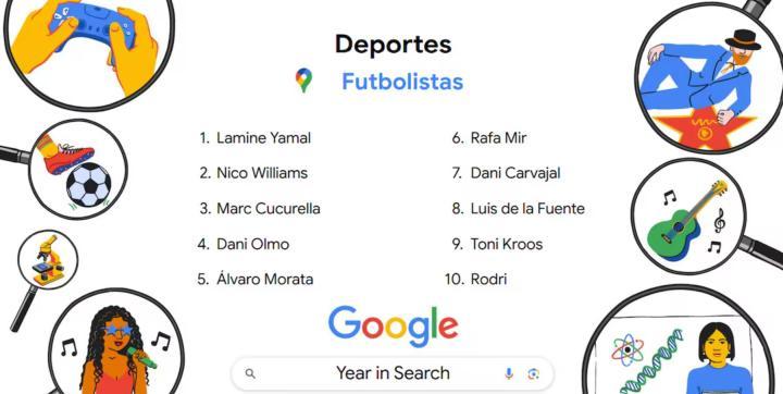 谷歌西班牙公布了西班牙年度足球运动员搜索排行榜单,亚马尔位列第一,尼科-威廉斯、库库雷利亚、达尼-奥尔莫、莫拉塔、拉法-米尔、卡瓦哈尔、路易斯-德拉富恩特、托尼-克罗斯、罗德里分列2-10位