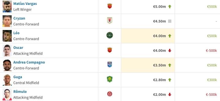 1. 马蒂亚斯-巴尔加斯(上海海港):500万欧元(+50万欧元)