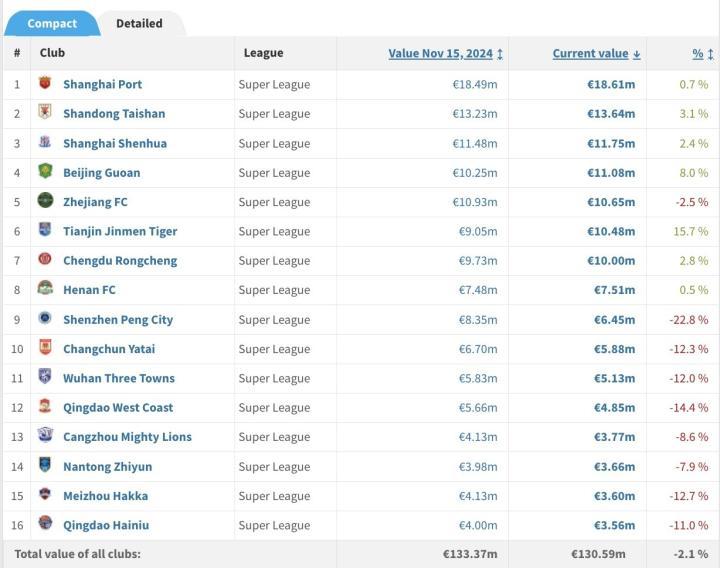 身价榜单显示,上海海港、山东泰山和上海申花排名前三,中超第三名的成都蓉城仅列第7,身价正好是1000万欧,排在成都之后的球队都没有超过千万欧。