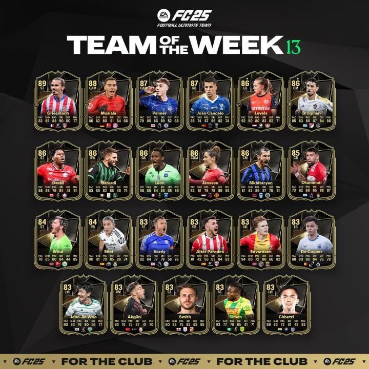 《FC25》刚刚上线了第13周的黑卡,格列兹曼、帕尔默、穆西亚拉、姆希塔良在列。