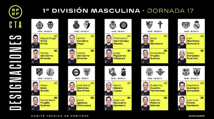 在这个周末,西甲联赛第17轮即将开赛。赛前,西班牙足协公布了本轮比赛的裁判安排。其中,昆特罗-冈萨雷斯执法巴萨vs莱加内斯的比赛,穆努埃拉执法皇马vs巴列卡诺的比赛。
