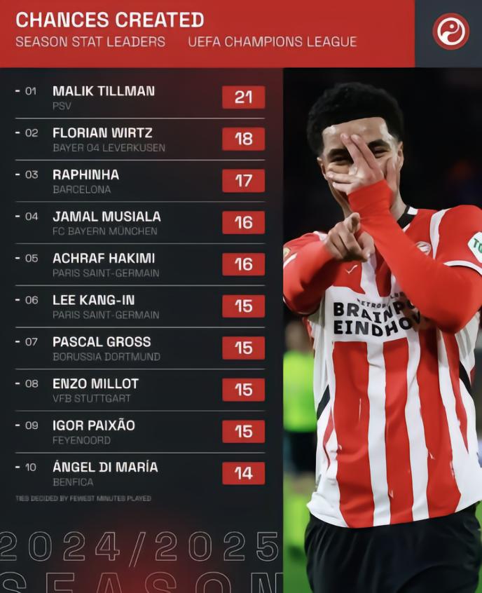 最近,Squawka统计了本赛季欧冠联赛球员创造机会数榜单。其中,埃因霍温的蒂尔曼以21次位居榜首,紧随其后的是勒沃库森新星维尔茨,他创造了18次机会。