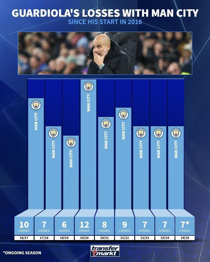 在欧冠0-2输给尤文图斯后,曼城本赛季各项赛事已遭遇7场失利,与他们上赛季整个赛季的输球场次持平。