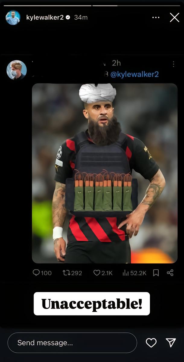 随后,沃克发出了另一个人对他的辱骂,图中可以看到,有人将沃克P成了恐怖分子的样子,对此,沃克表示:“不可接受!”
