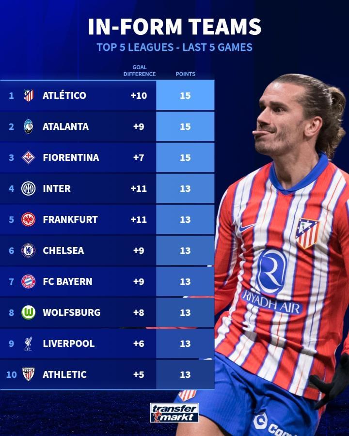 五大联赛新一轮比赛将在周末开打,周五,德国转会市场列出了五大联赛最近5轮联赛中状态最好的球队,其中马竞、亚特兰大、佛罗伦萨居首。