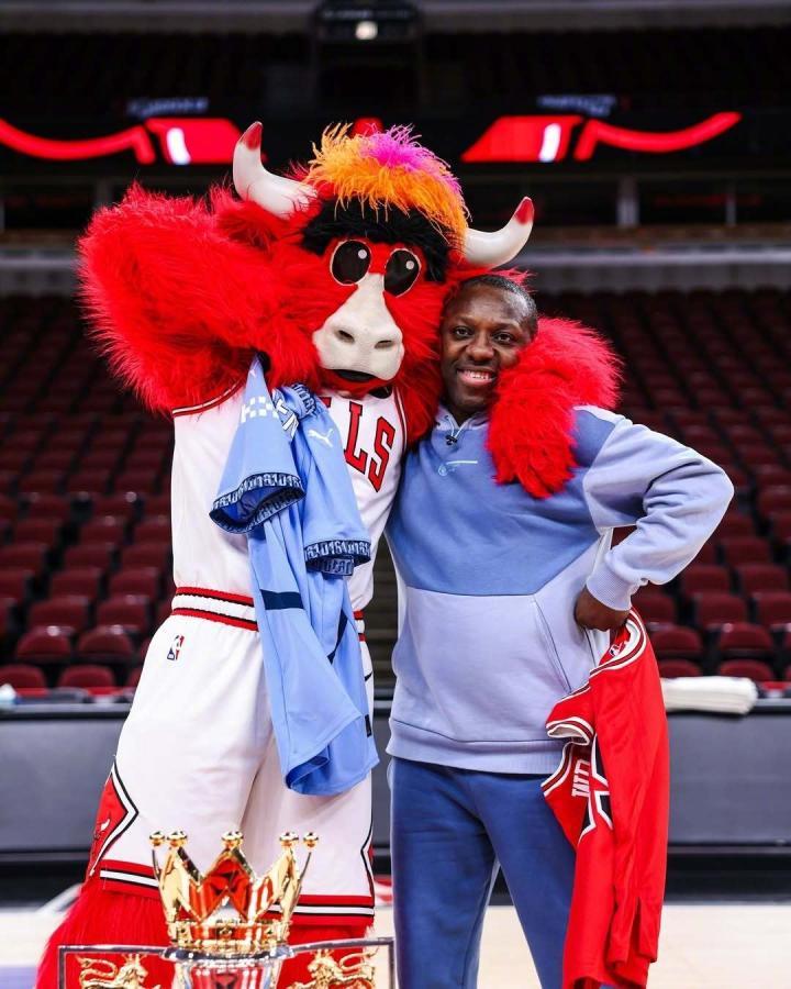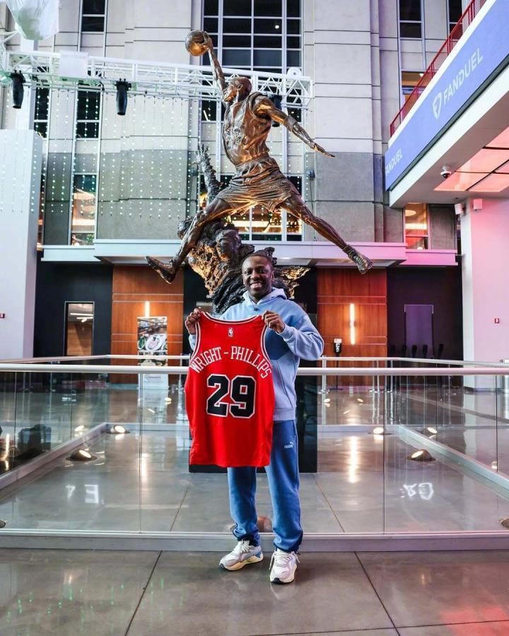 据NBA球队芝加哥公牛官方消息,曼城名宿赖特-菲利普斯携带奖杯造访了芝加哥公牛主场。