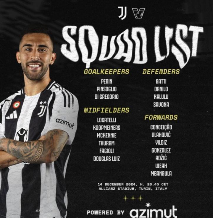 意甲联赛第16轮,尤文将在主场迎战威尼斯。赛前,尤文官方公布了本场比赛的大名单。弗拉霍维奇领衔锋线,达尼洛、库普梅纳斯、麦肯尼等人在列。