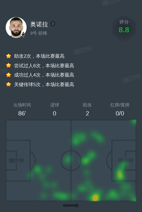 北京时间12月14日门兴格拉德巴赫vs荷尔斯泰因基尔,奥诺拉2助攻,5次关键传球,3次射门,4次成功过人。