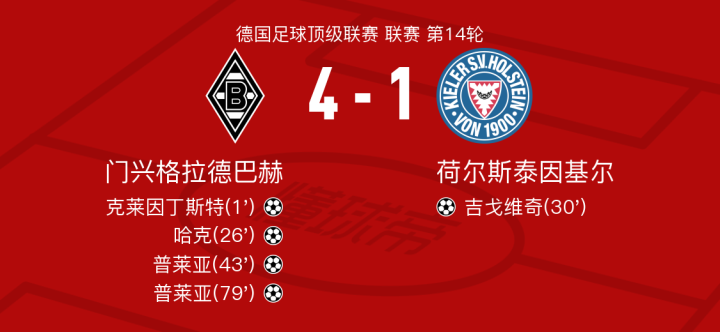 北京时间12月14日门兴格拉德巴赫vs荷尔斯泰因基尔,普莱亚得到全场最高的9.0分,伊韦齐奇得到全场最低的5.6分