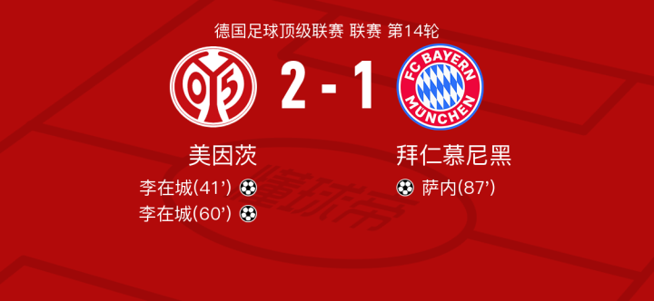 北京时间12月14日美因茨vs拜仁慕尼黑,李在城得到全场最高的8.3分,姆韦内得到全场最低的6.0分