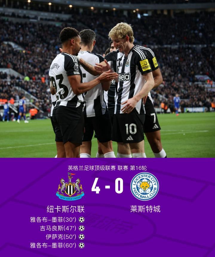 纽卡4-0大胜莱斯特城,雅各布-墨菲梅开二度,伊萨克传射建功