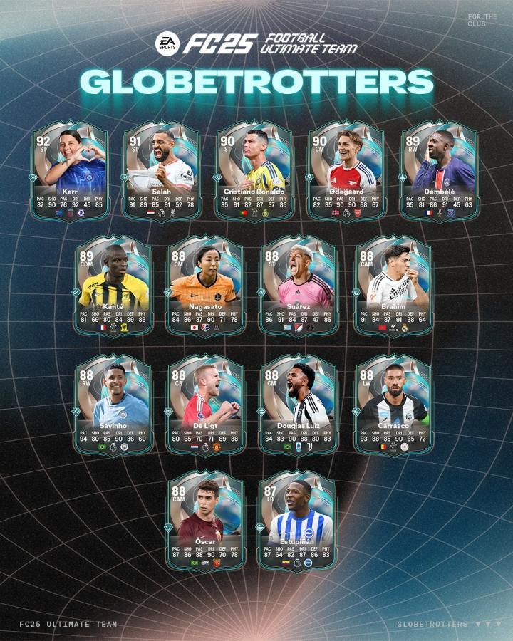 《FC25》在本周末上线了环球旅者,该卡将会带来化学加成(2点国家、2点联赛、2点俱乐部),C罗、登贝莱、萨拉赫、厄德高、坎特领衔。