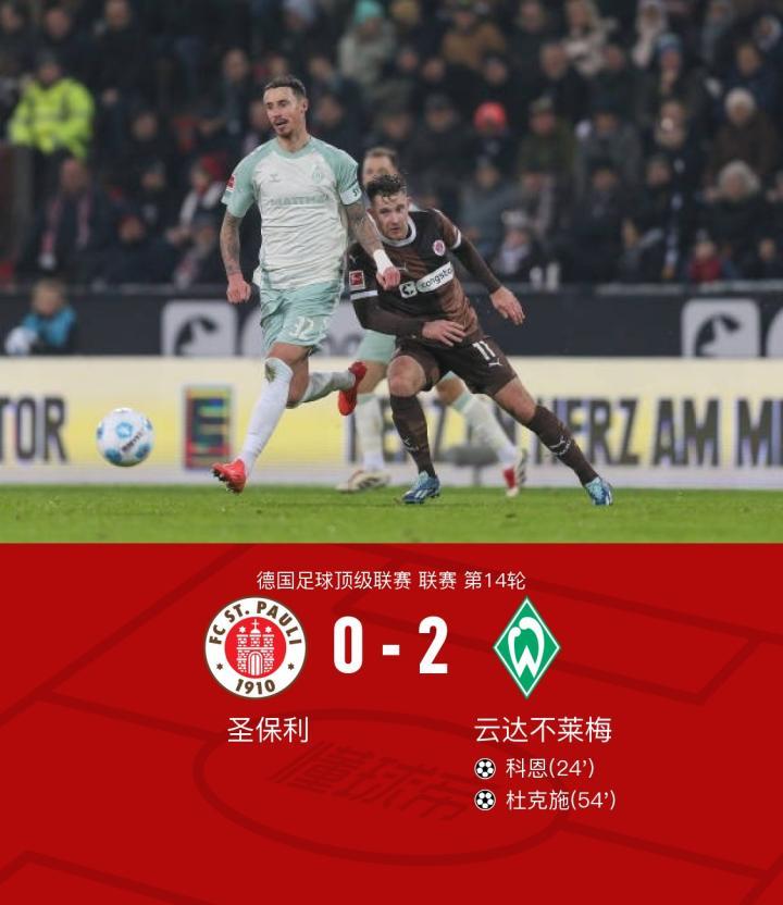 圣保利0-2云达不莱梅,科恩首开纪录,杜克施破门