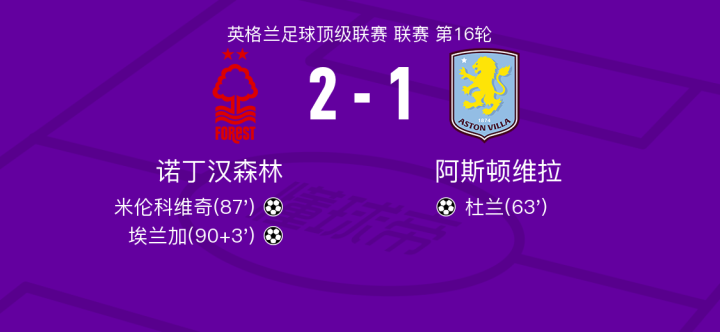 北京时间12月15日诺丁汉森林vs阿斯顿维拉,埃利奥特-安德森得到全场最高的8.4分,博利得到全场最低的5.9分