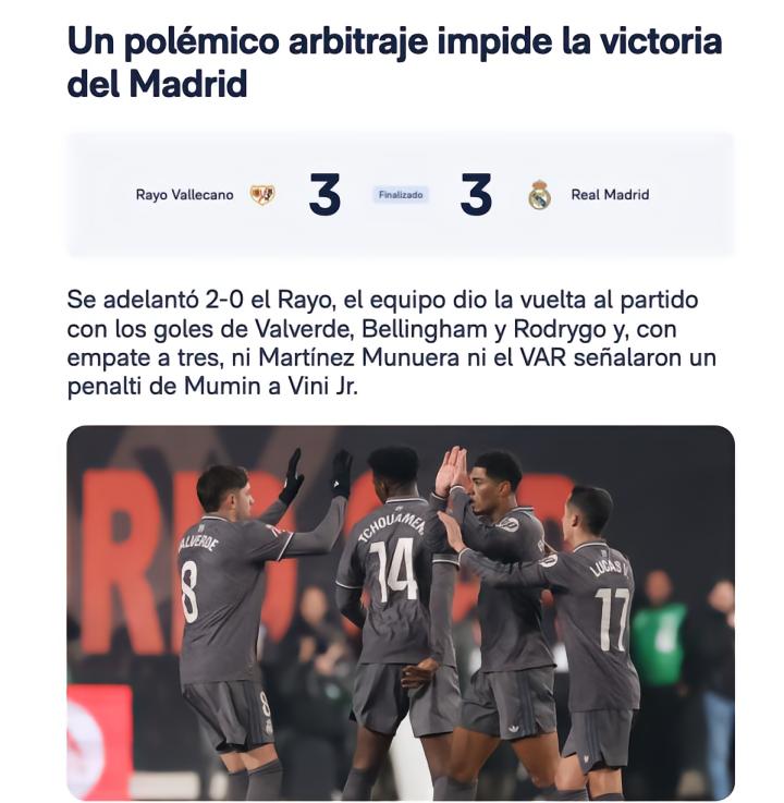 文中写道:“巴列卡诺曾以2-0领先,但皇马凭借巴尔韦德、贝林厄姆和罗德里戈的进球将比分反超。然而,在比分为3-3时,马丁内斯-穆努埃拉和VAR都没有对穆明对维尼修斯的犯规判罚点球。”
