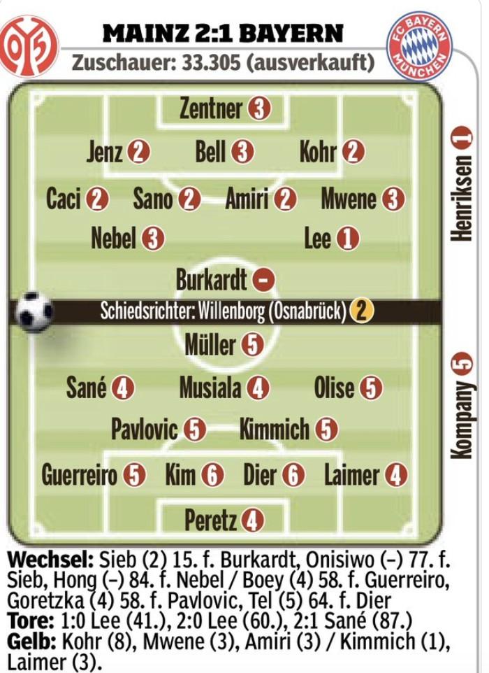德甲第14轮,拜仁客场1-2不敌美因茨。赛后,德国媒体《图片报》对双方球员进行了评分。