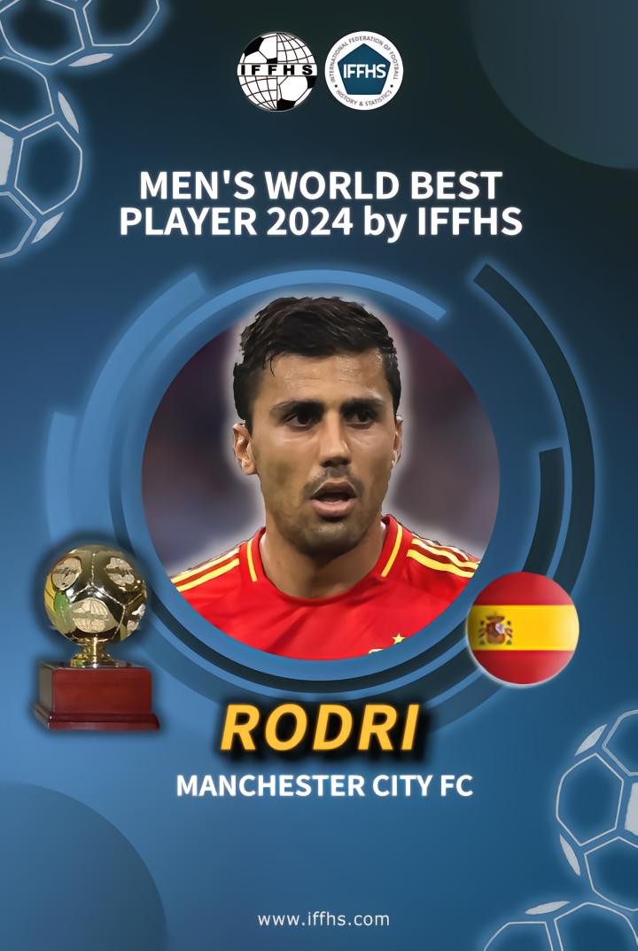继莱万(2020年和2021年)、梅西(2022年)、哈兰德(2023年)之后,罗德里获得了IFFHS2024年度最佳球员奖。